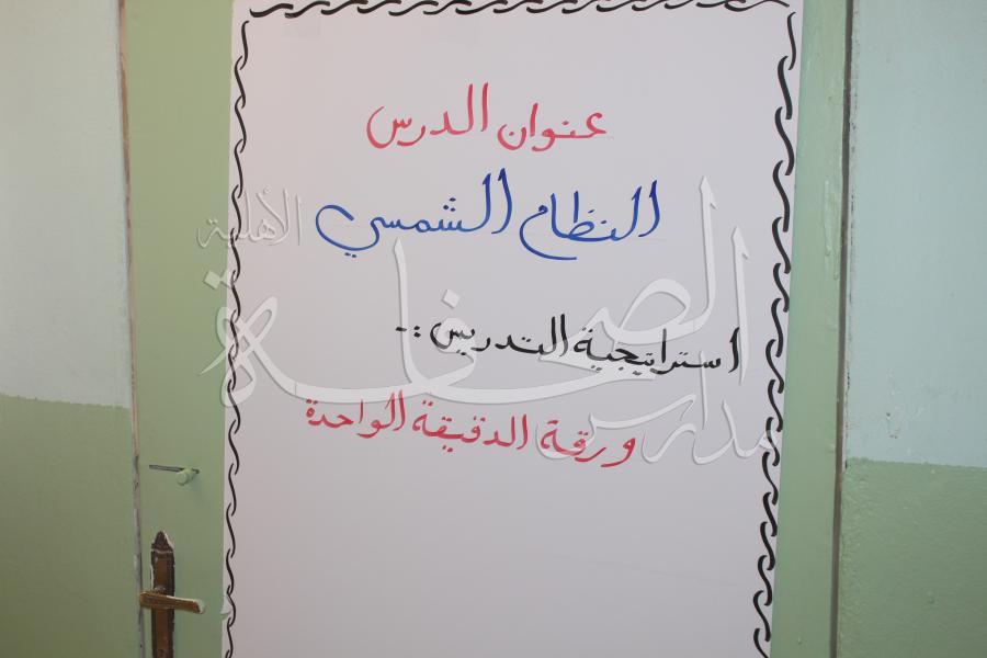قدم الأستاذ/ محمود عبد العزيز بحضور المشرف المقيم، والأستاذ/ مجاهد الهجوة درساً تطبيقياً، طبق فيه بعض استراتيجيات التعلم النشط (الدقيقة الواحدة-العصف الذهني-الاستقراء)، مستخدماً السبورة الذكية، ونموذجاً عن المجموعة الشمسية، وفيديو عن حركة الكواكب، والنيازك والشهب، وتم تقييم الطلاب من خلال أوراق عمل حُلت من قبل الطلاب.
