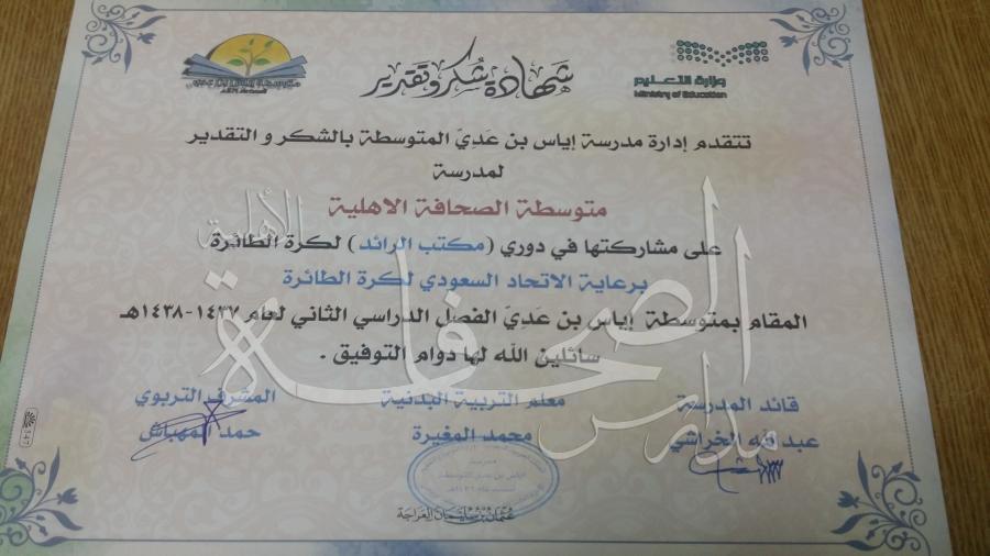 شاركت متوسطة الصحافة الأهلية في بطولة الكرة الطائرة على مستوى مكتب الرائد وبالتعاون مع الاتحاد السعودي للكرة الطائرة، وفاز منتخب المدرسة بالمركز الثالث والميداليات البرونزية.