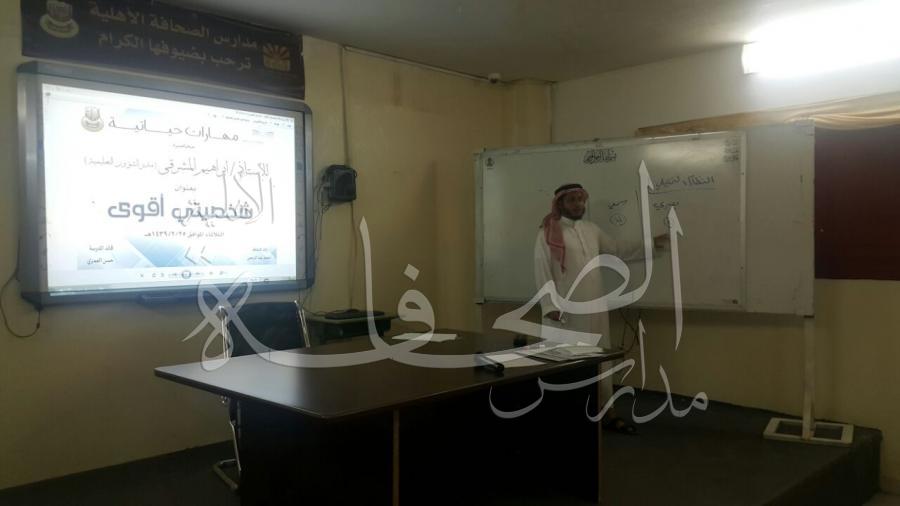 ضمن برنامج المهارات الحياتية لطلاب المرحلة الثانوية بهدف تنمية ثقافة الطالب بقدرتِه على التعاملِ بنجاحٍ مع متغيراتِ الحياة المختلفة؛ قام الأستاذ/ إبراهيم المشرقي مدير الشؤون التعليمية بالمدارس، بإلقاء محاضرة للطلاب بعنوان (شخصيتي أقوى)، وذلك يوم الثلاثاء الموافق 24-2-1439هـ.