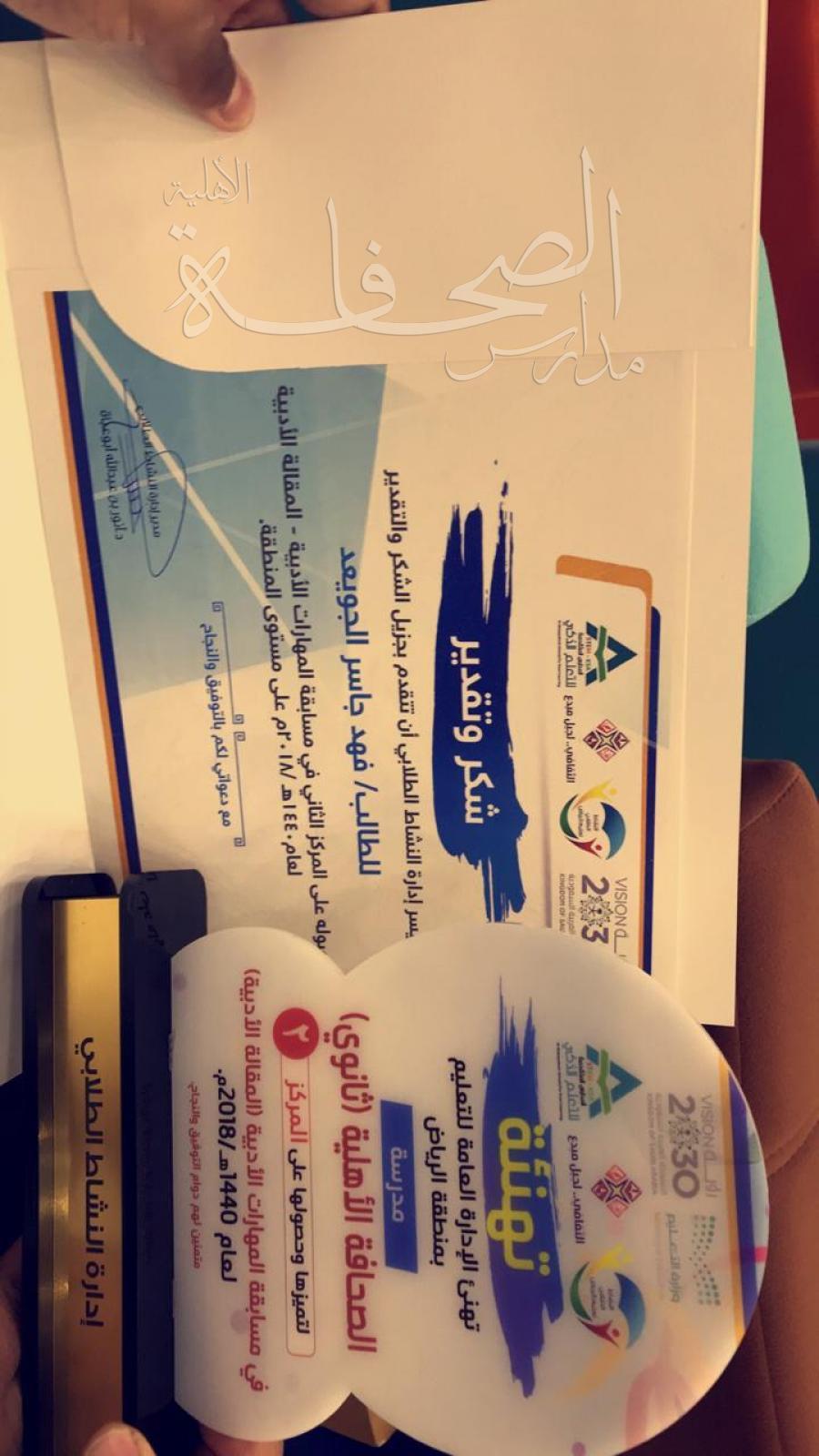 تكريم الطالب / فهد جاسر الجويعد الفائز في مسابقة المهارات الأدبية ( فرع المقالة الأدبية )، بالمركز الثاني على مستوى إدارة تعليم الرياض، حيث تم تكريم الطالب من سعادة الدكتور/ أنور أبو عباة  مدير النشاط الطلابي بإدارة تعليم الرياض، وذلك يوم الثلاثاء الموافق 19-3-1440هـ.