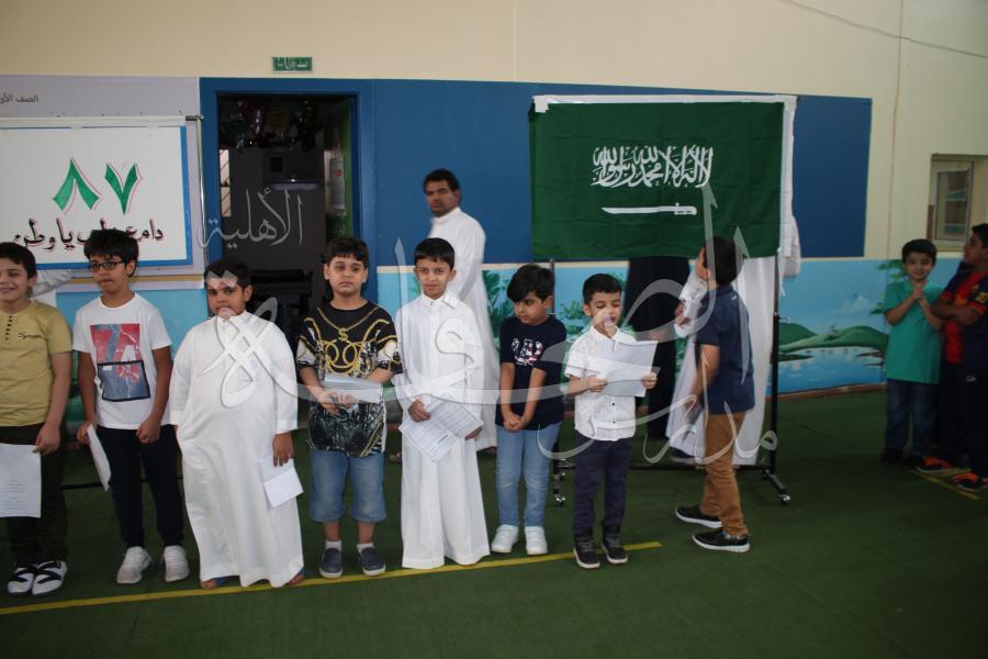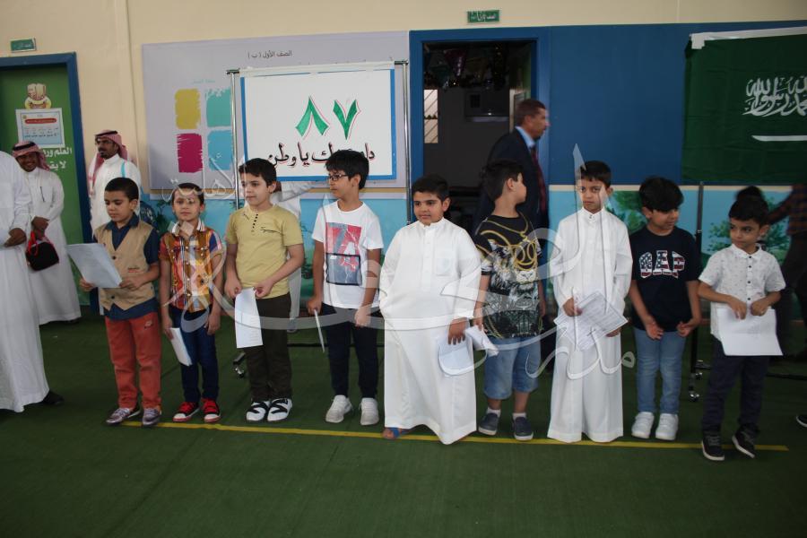 جانب من فعاليات اليوم الوطني في الإذاعة المدرسية بالصفوف الأولية، خلال الأسبوع التمهيدي، قدم الإذاعة طلاب الصف الثالث الابتدائي (أ)