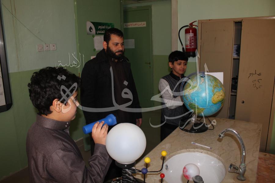 قدم الأستاذ/ محمود عبد العزيز بحضور المشرف المقيم، والأستاذ/ مجاهد الهجوة درساً تطبيقياً، طبق فيه بعض استراتيجيات التعلم النشط (الدقيقة الواحدة-العصف الذهني-الاستقراء)، مستخدماً السبورة الذكية، ونموذجاً عن المجموعة الشمسية، وفيديو عن حركة الكواكب، والنيازك والشهب، وتم تقييم الطلاب من خلال أوراق عمل حُلت من قبل الطلاب.