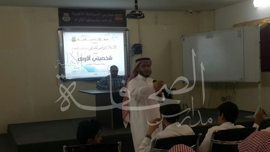ضمن برنامج المهارات الحياتية لطلاب المرحلة الثانوية بهدف تنمية ثقافة الطالب بقدرتِه على التعاملِ بنجاحٍ مع متغيراتِ الحياة المختلفة؛ قام الأستاذ/ إبراهيم المشرقي مدير الشؤون التعليمية بالمدارس، بإلقاء محاضرة للطلاب بعنوان (شخصيتي أقوى)، وذلك يوم الثلاثاء الموافق 24-2-1439هـ.