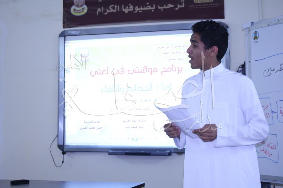 ضمن خطة المسابقات الداخلية للنشاط الطلابي تم إقامة مسابقة الإلقاء والخطابة (موهبتي في لغتي)، والتي شارك فيها عدد كبير من الطلاب من الصفوف المختلفة، تحت إشراف النادي الأدبي المدرسي والمشرف التربوي أ / ياسر قطب، يوم الثلاثاء الموافق 18 -2-1439هـ.